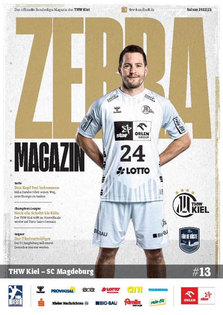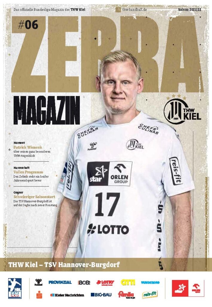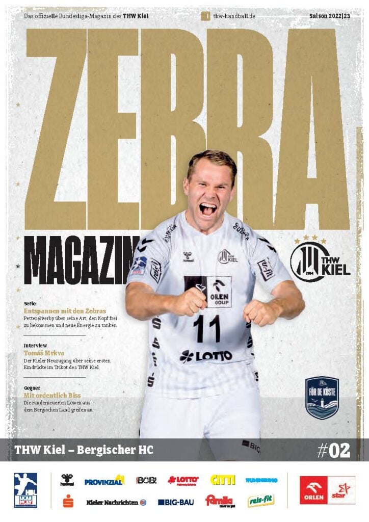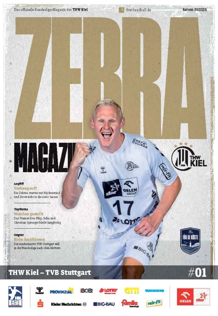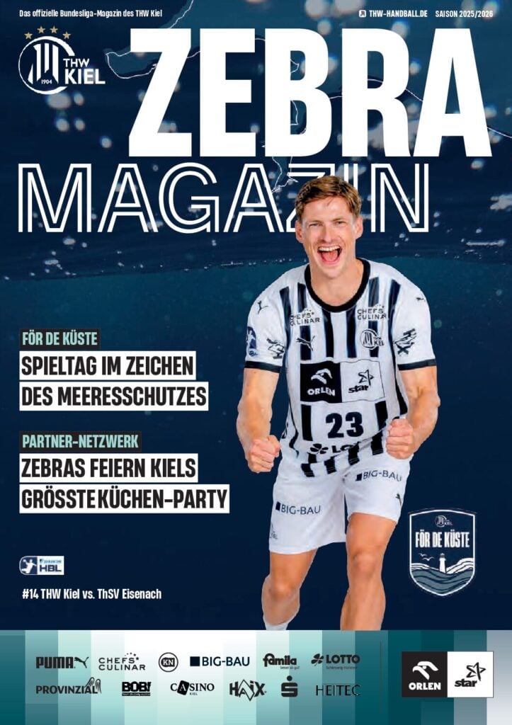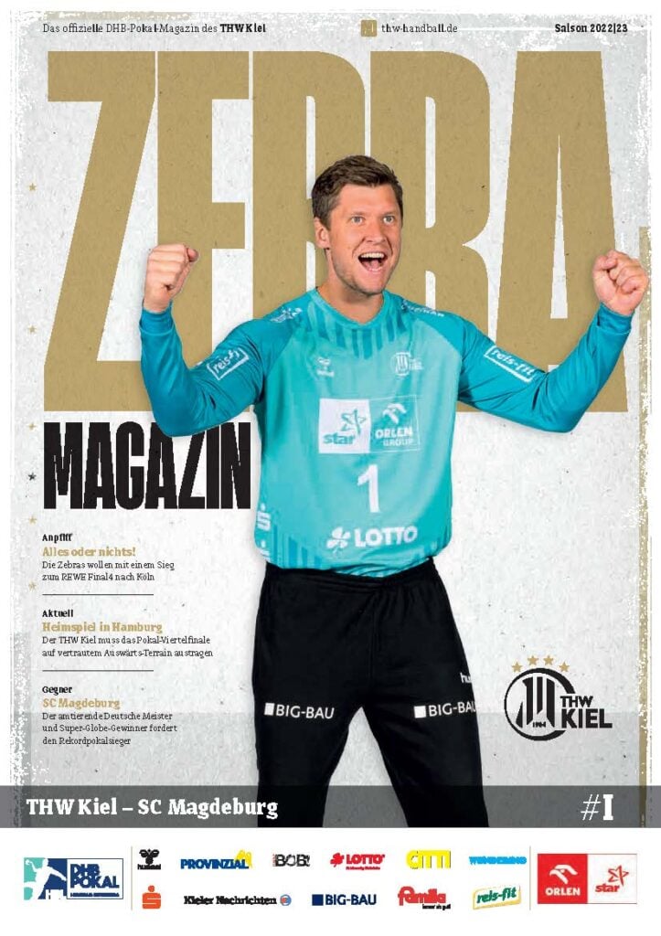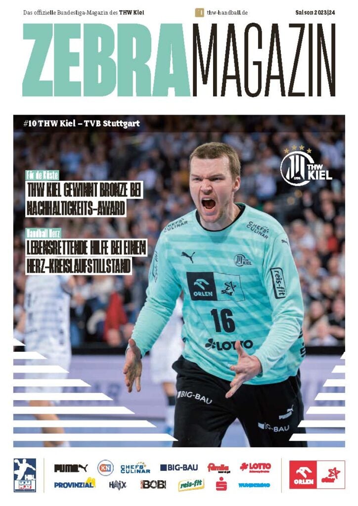 Ein lächelnder Handballspieler in einem weiß-schwarz gestreiften Trikot steht auf dem Spielfeld und hält einen Ball in der Hand. Das Zebra Magazin, die offizielle Ausgabe des THW Kiel Hallenhefts Handball, zeigt ihn auf dem Cover, umgeben von Schlagzeilen und Logos.