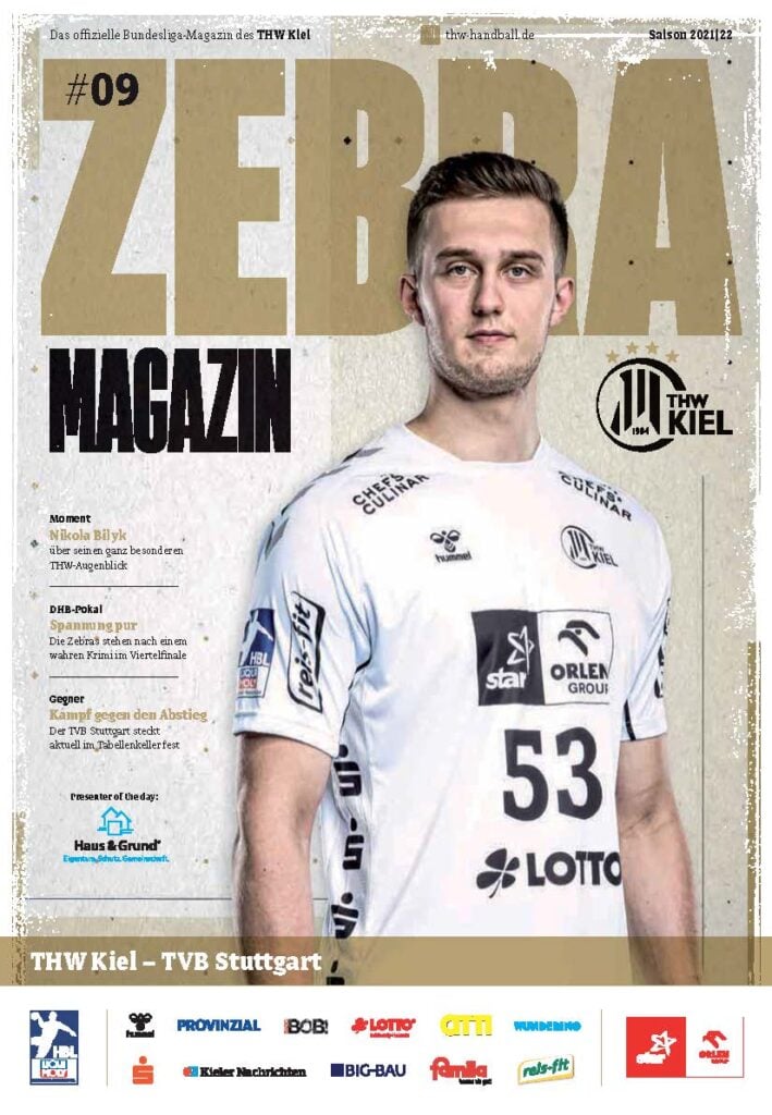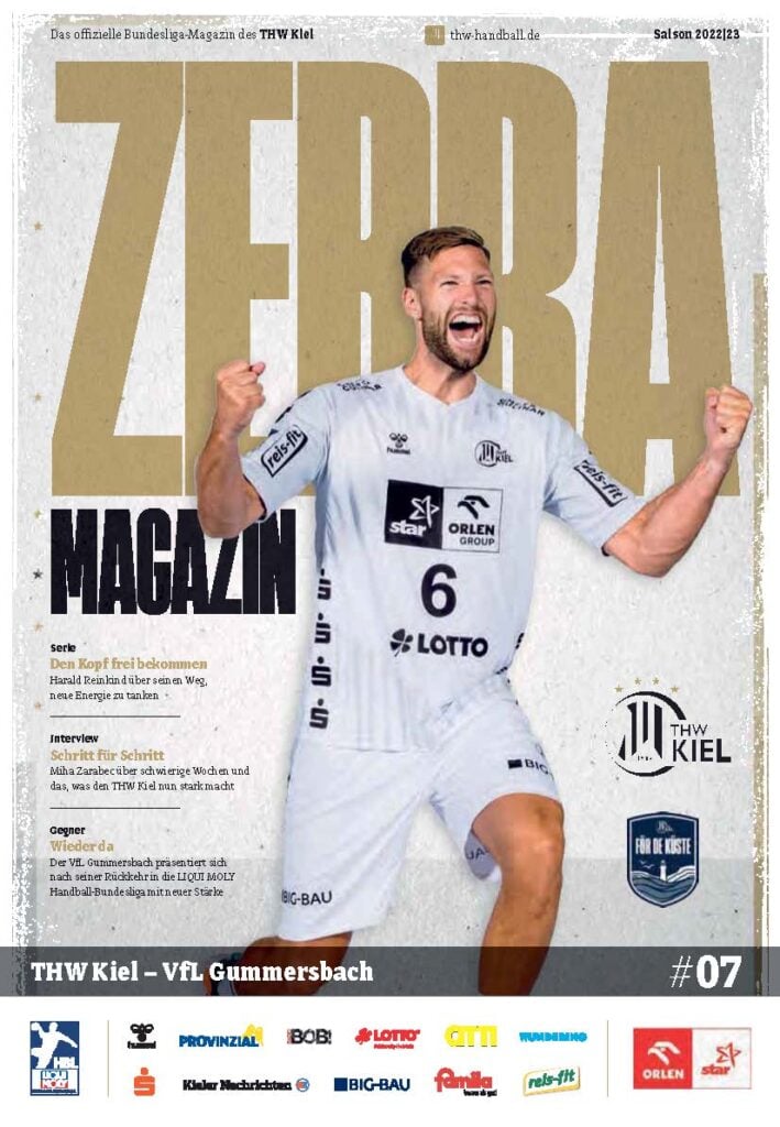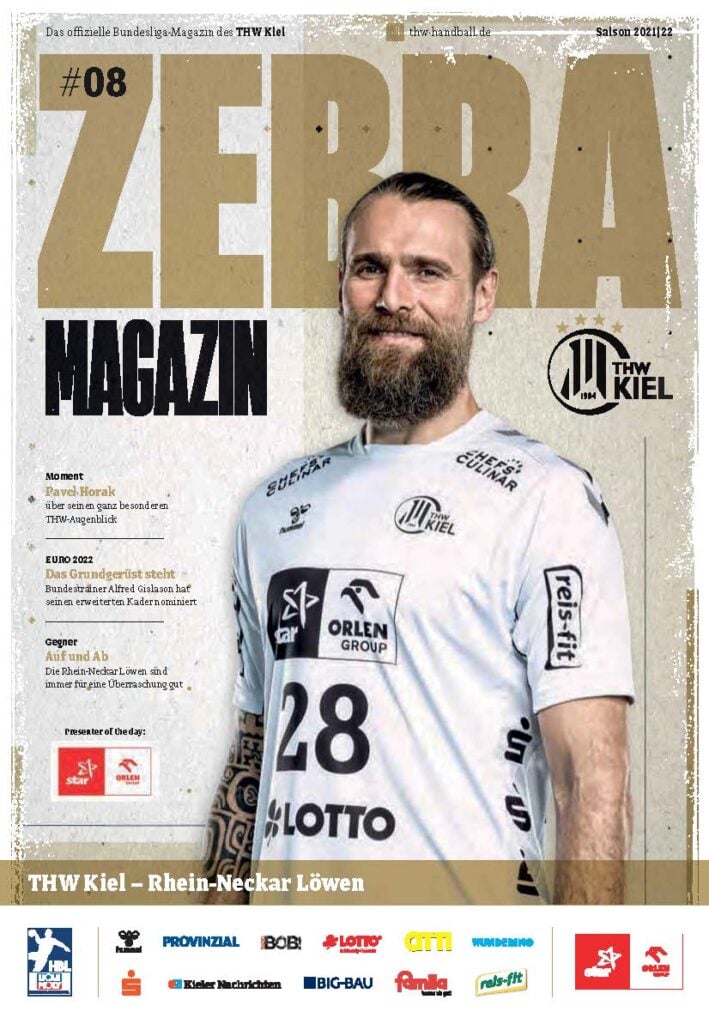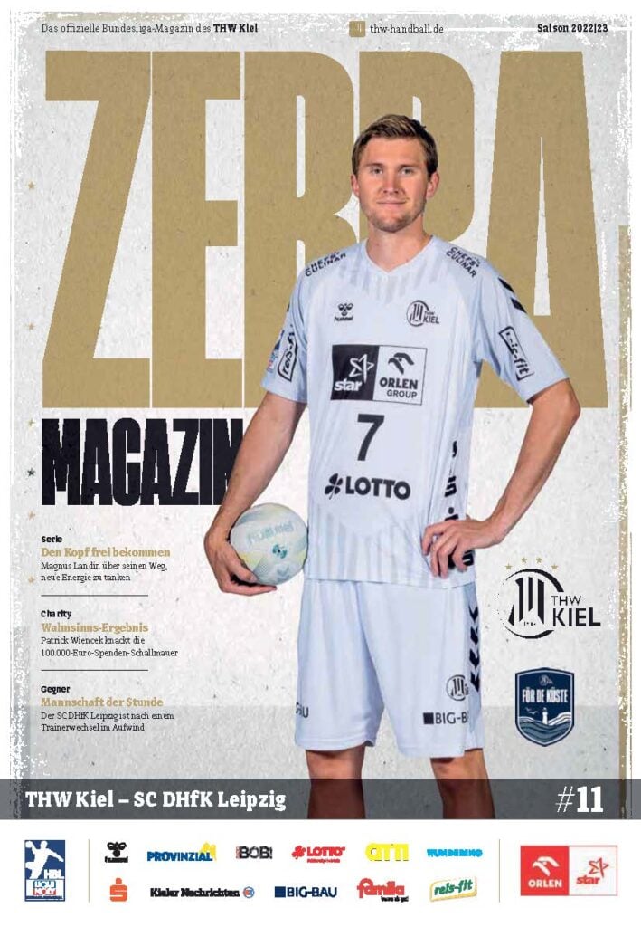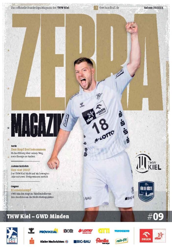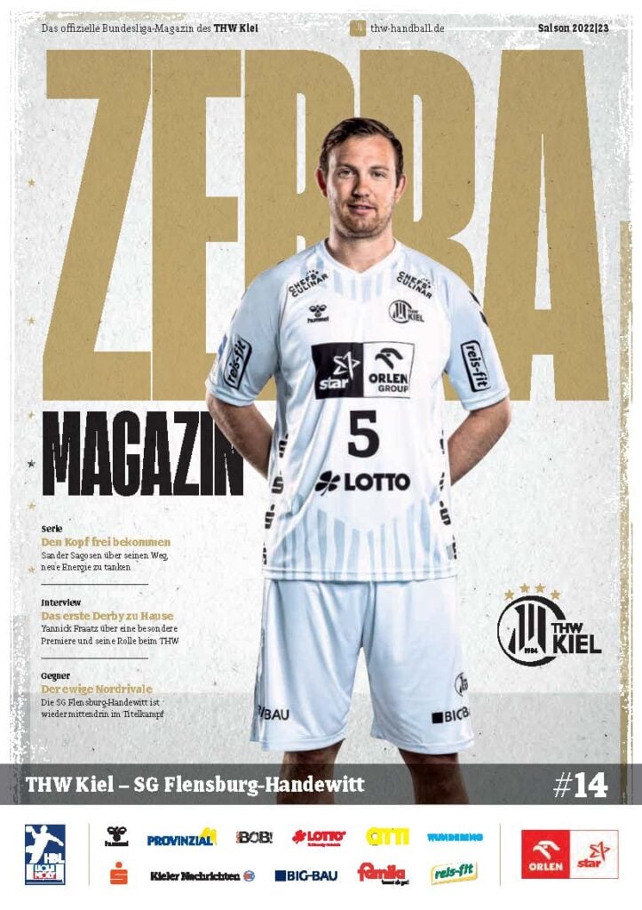 Ein lächelnder Handballspieler in einem weiß-schwarz gestreiften Trikot steht auf dem Spielfeld und hält einen Ball in der Hand. Das Zebra Magazin, die offizielle Ausgabe des THW Kiel Hallenhefts Handball, zeigt ihn auf dem Cover, umgeben von Schlagzeilen und Logos.