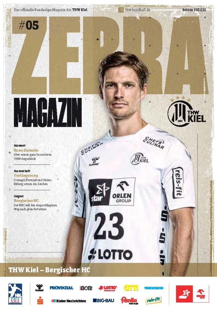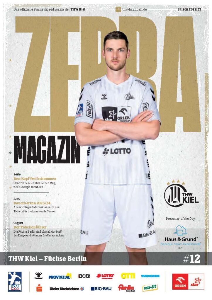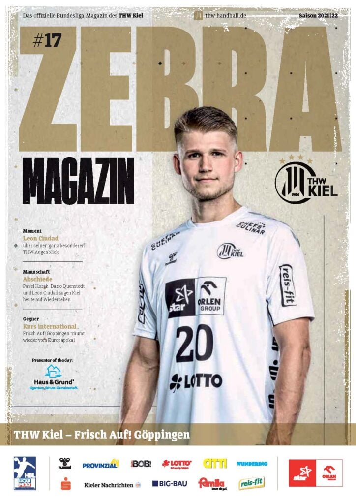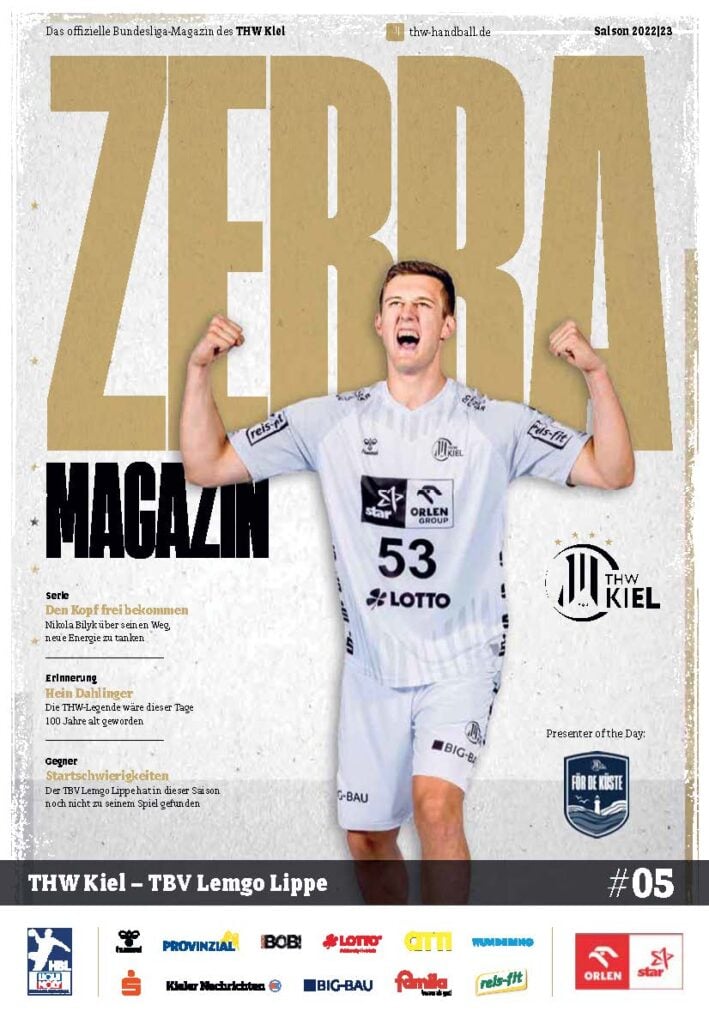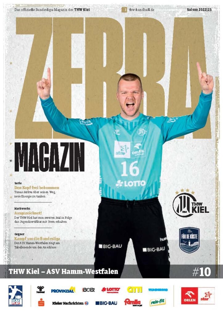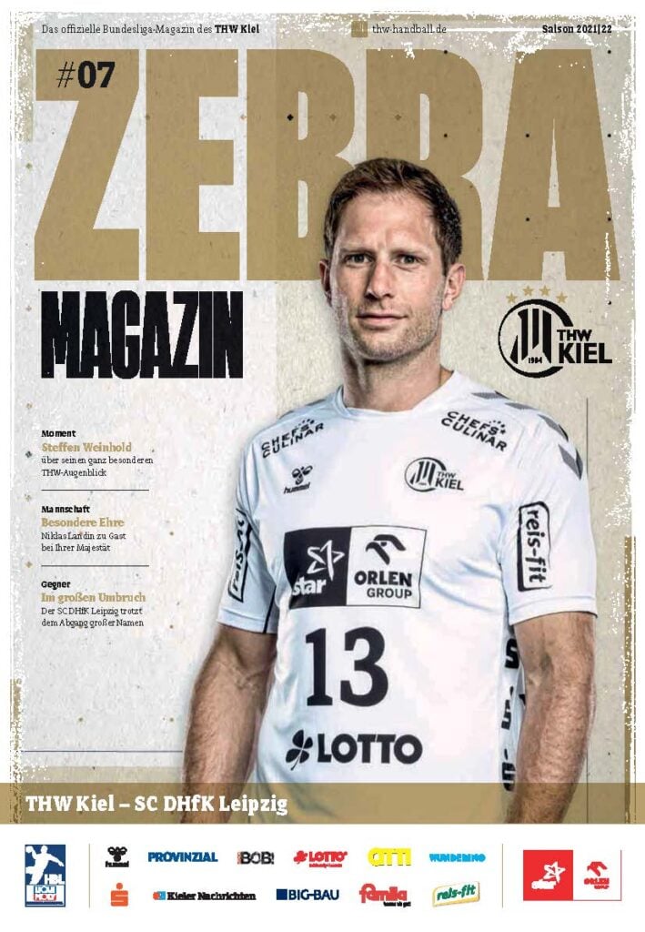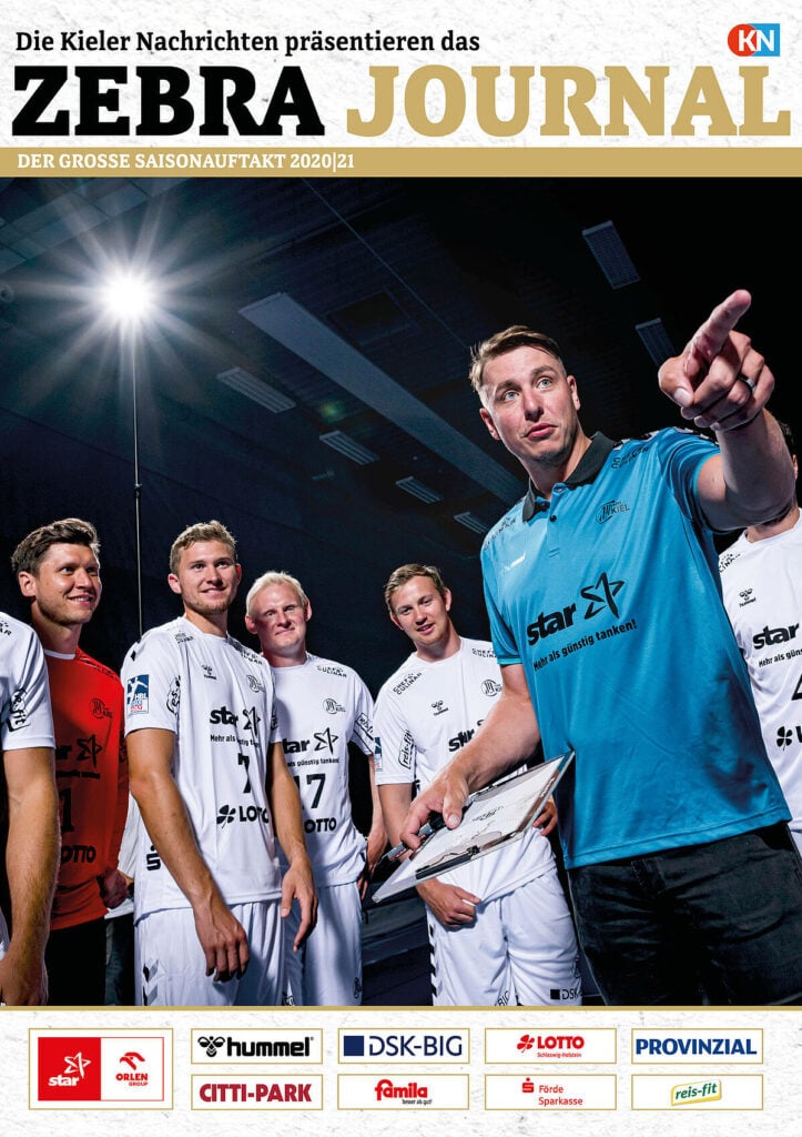 Ein lächelnder Handballspieler in einem weiß-schwarz gestreiften Trikot steht auf dem Spielfeld und hält einen Ball in der Hand. Das Zebra Magazin, die offizielle Ausgabe des THW Kiel Hallenhefts Handball, zeigt ihn auf dem Cover, umgeben von Schlagzeilen und Logos.
