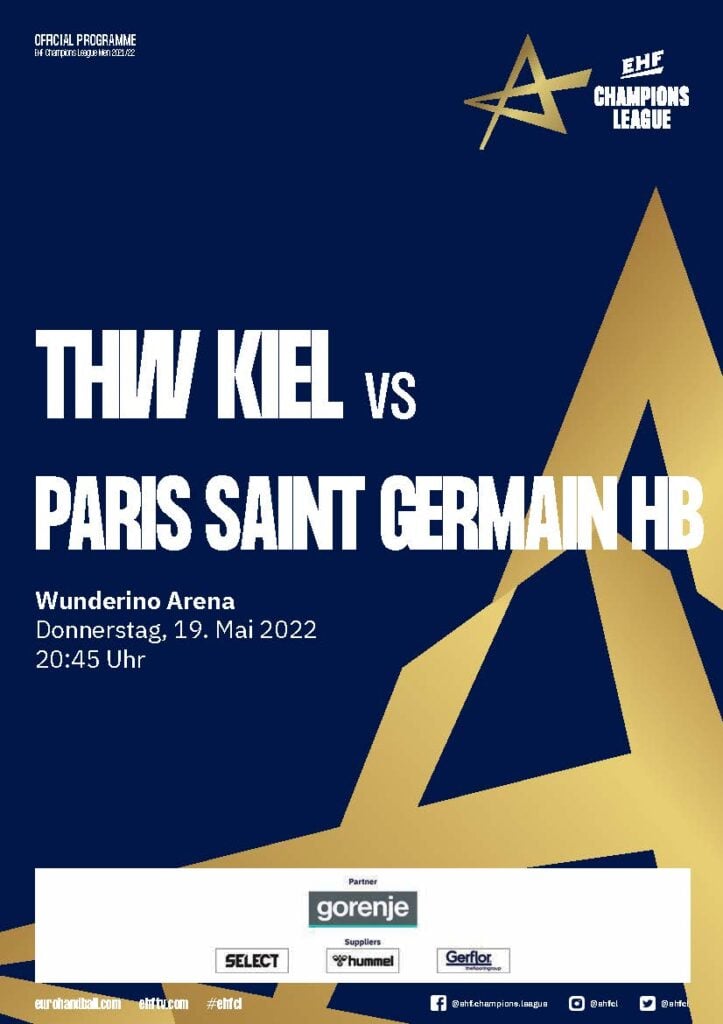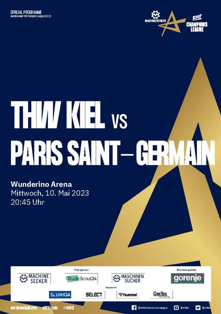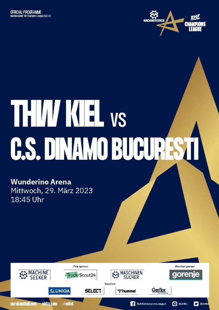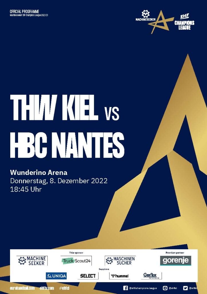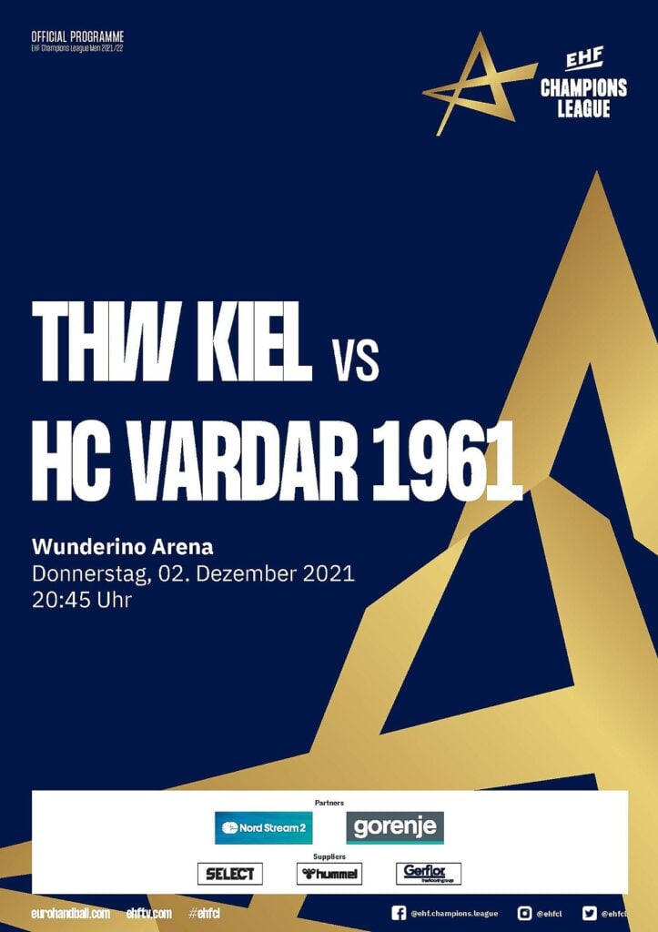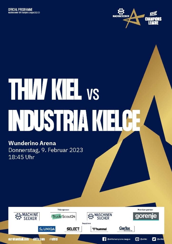 Ein Handballspieler im weißen THW-Kiel-Trikot mit schwarzen Streifen springt während eines Spiels zum Ballwurf. Der Umschlag des Hallenhefts zeigt Schlagzeilen in deutscher Sprache und verschiedene Sponsorenlogos am unteren Rand.