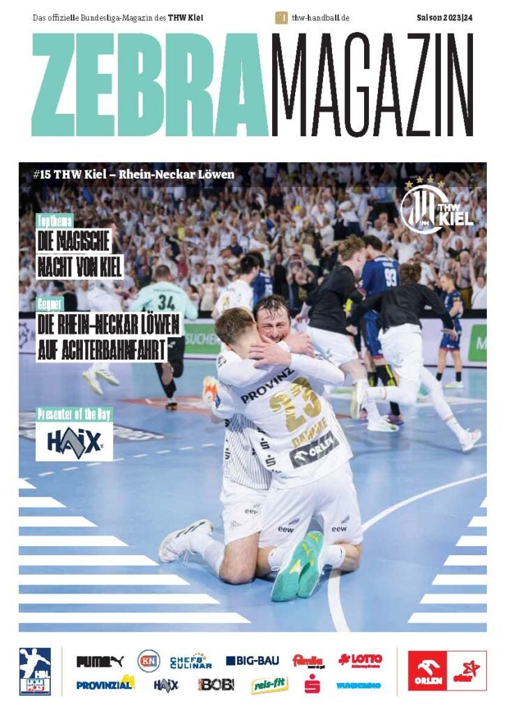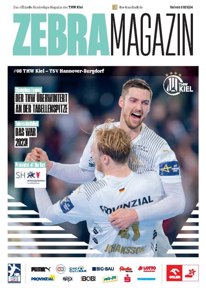 Ein Handballer im weiß-blau gestreiften Trikot feiert mit erhobenen Armen auf dem Cover des Zebra Magazins, dem offiziellen Hallenheft des THW Kiel, mit Schlagzeilen in deutscher Sprache und verschiedenen Sponsorenlogos am unteren Rand.